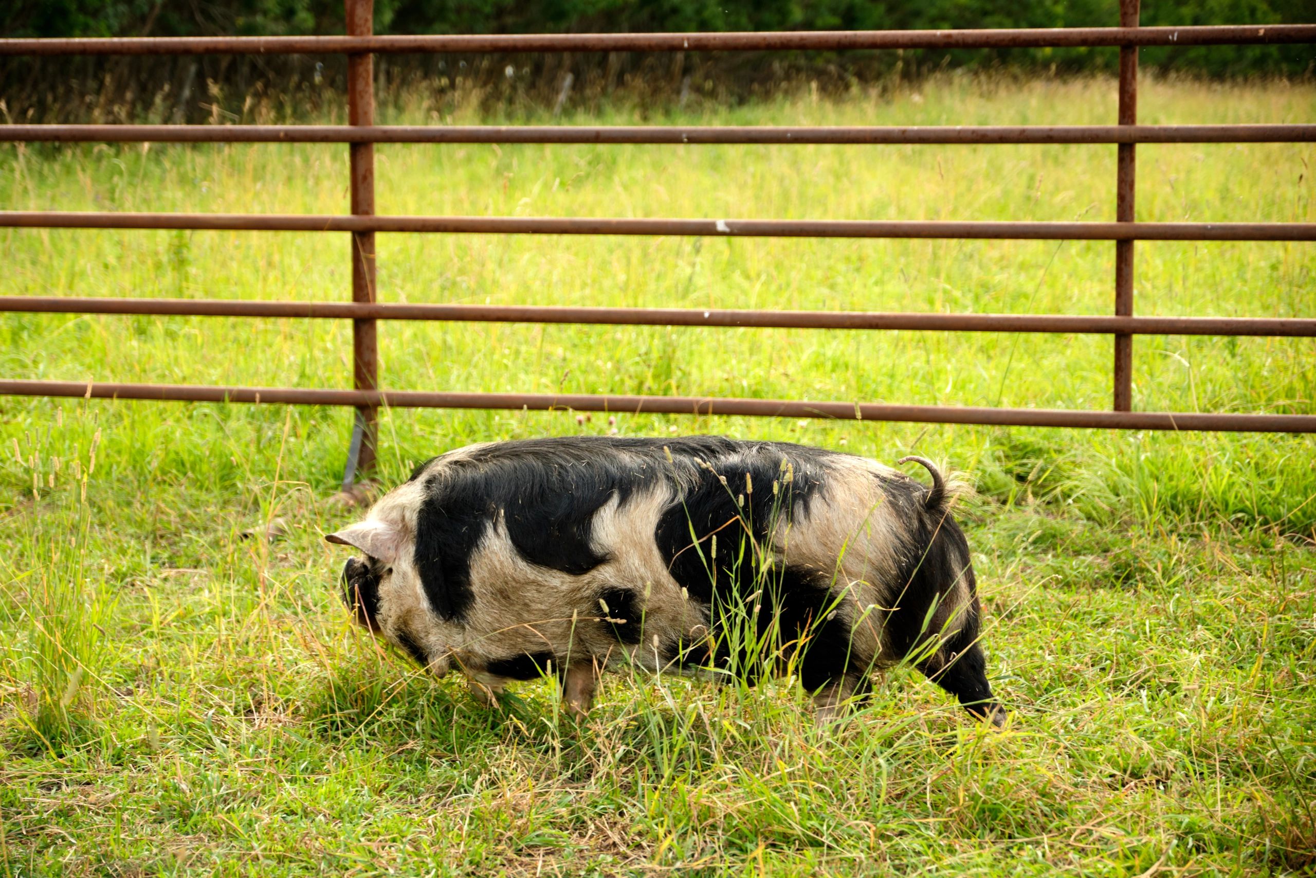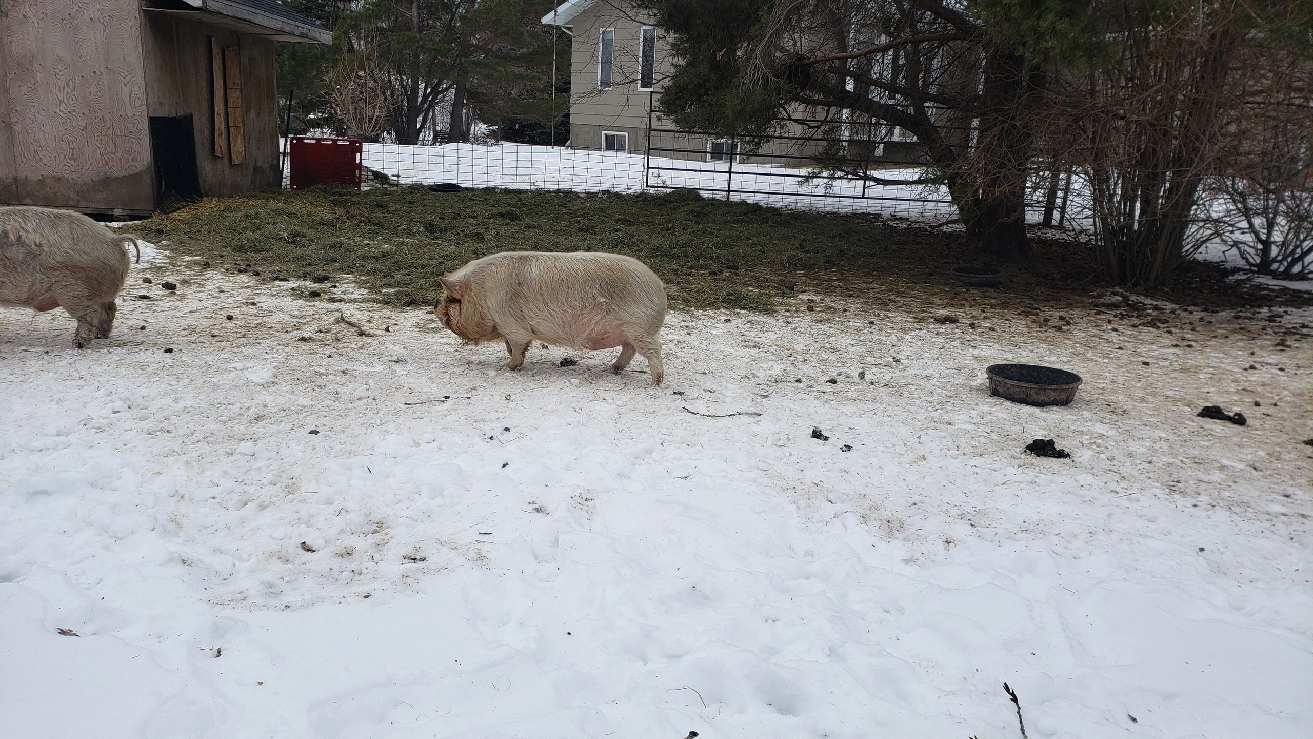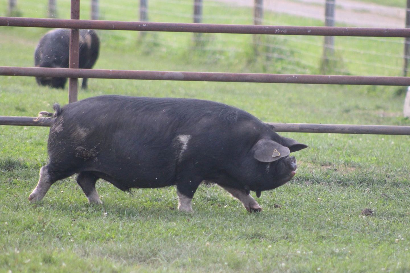 This guy is a son of two of our largest pigs that have played a vital role in our pasture pork program. This boar easily exceeded 300lbs at 18 month weigh in but his strong bone and pasterns.
