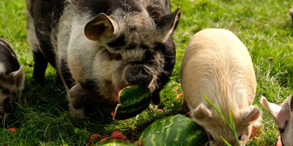 Kunekune's are very well known for their docility and friendly outgoing personalities, including sows with piglets and boars. Due to their docility, they have little desire to test fencing and roam which makes them a breed suitable for first time pig owner. They are a smaller breed of pig averaging 180-400 lbs.